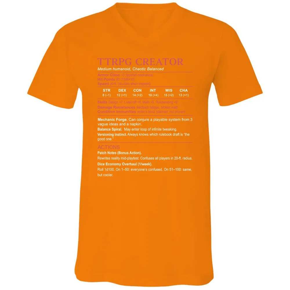 TTRPG Creator Stats Unisex V-Neck T-Shirt - Orange - 11